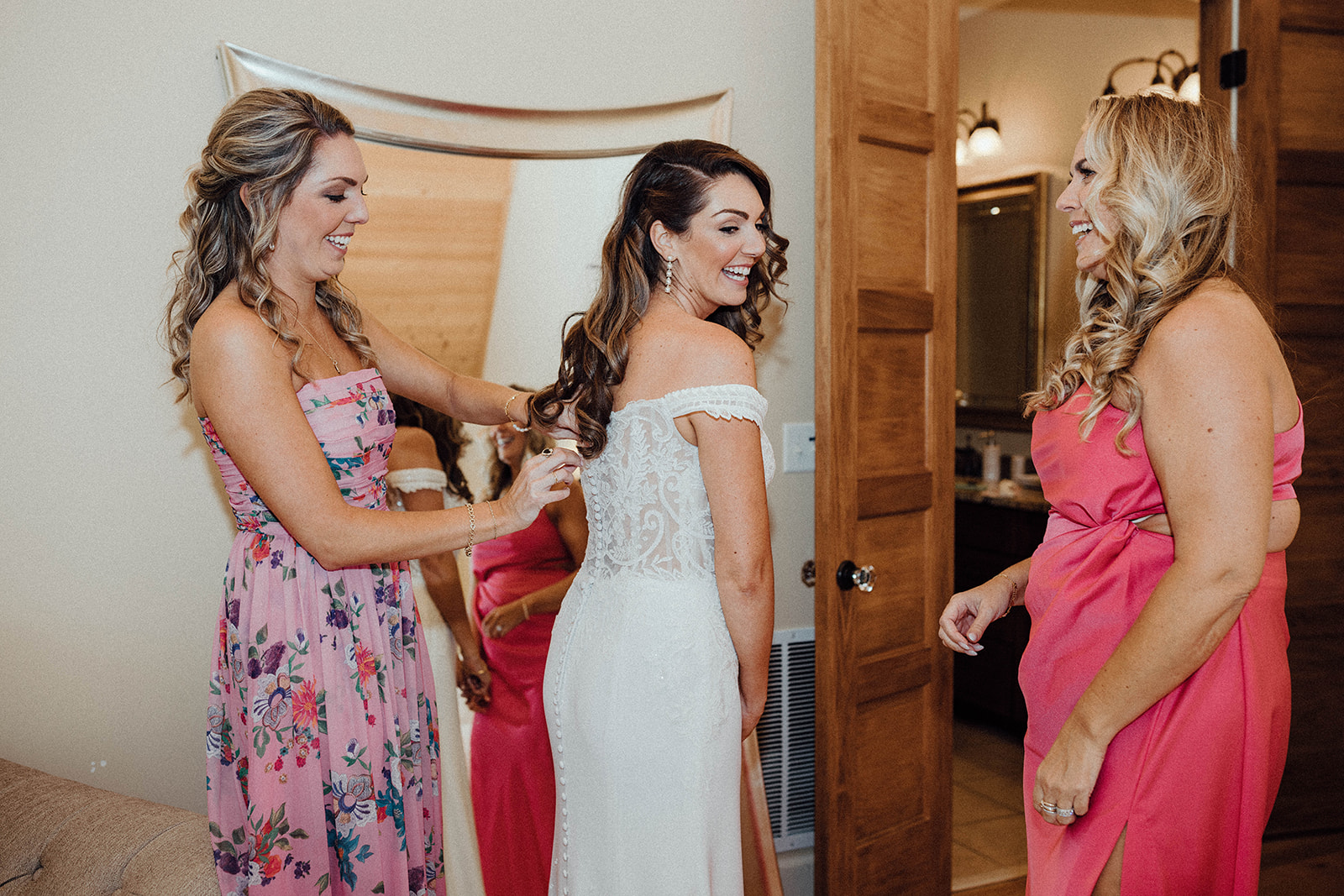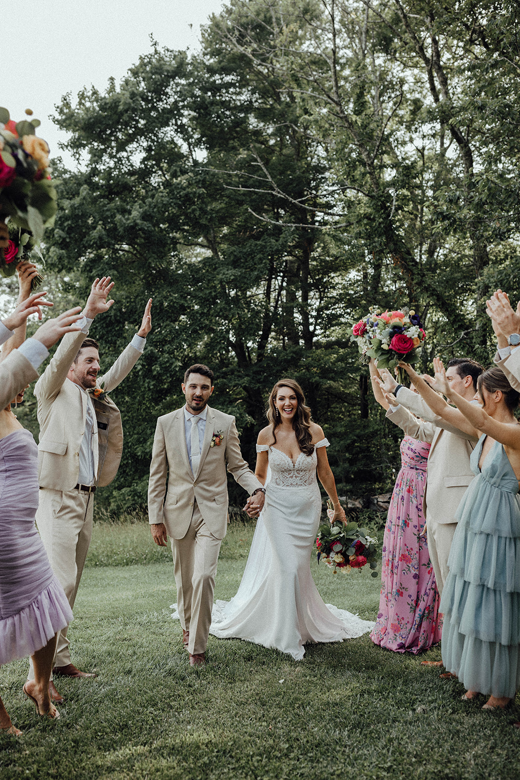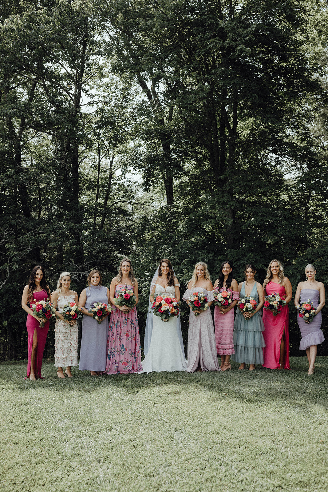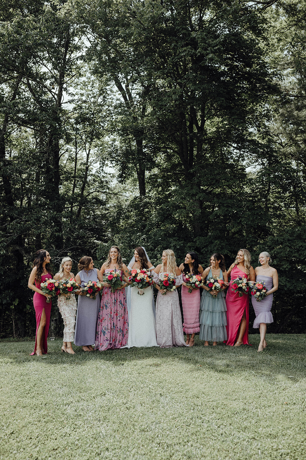 Kelsey’s bridesmaids are wearing mismatched bridesmaids dresses, and I’m obsessed with this trend! It adds so much fun and uniqueness to your wedding day style. Plus, it shows off everyone’s personality and personal style!