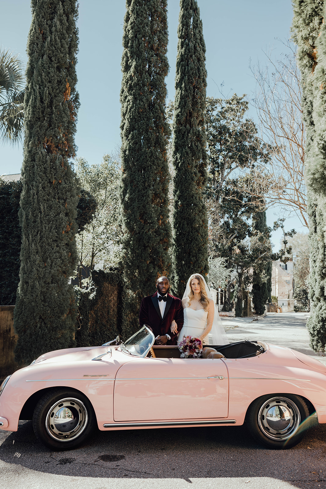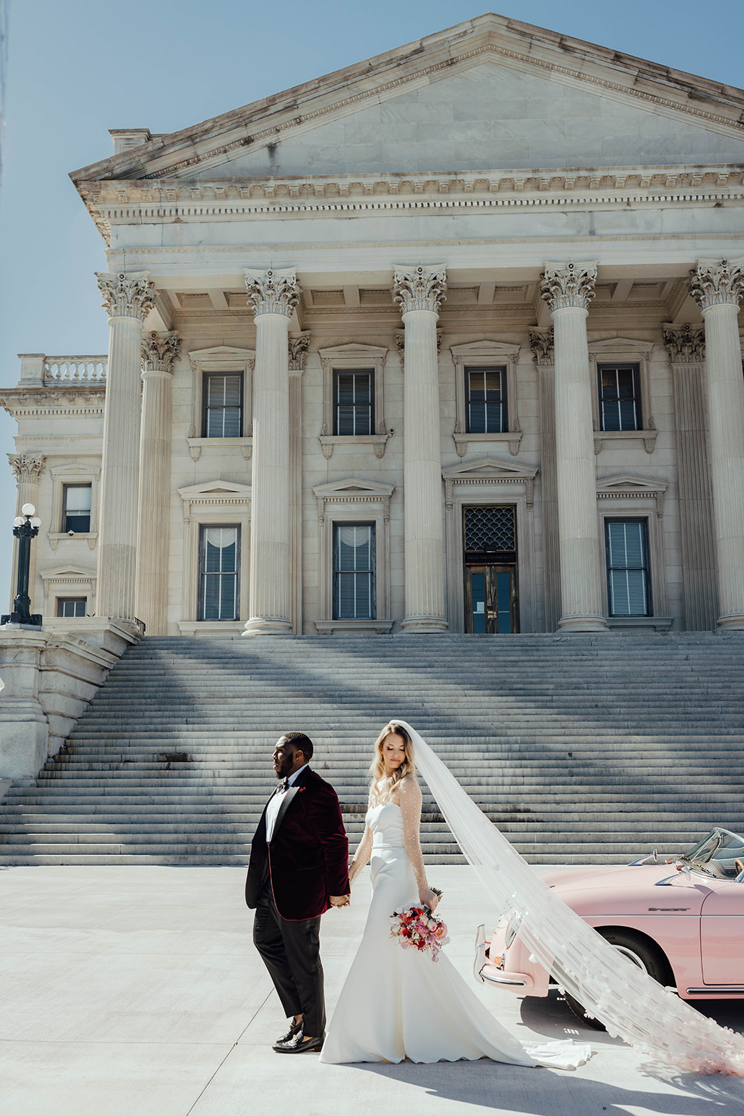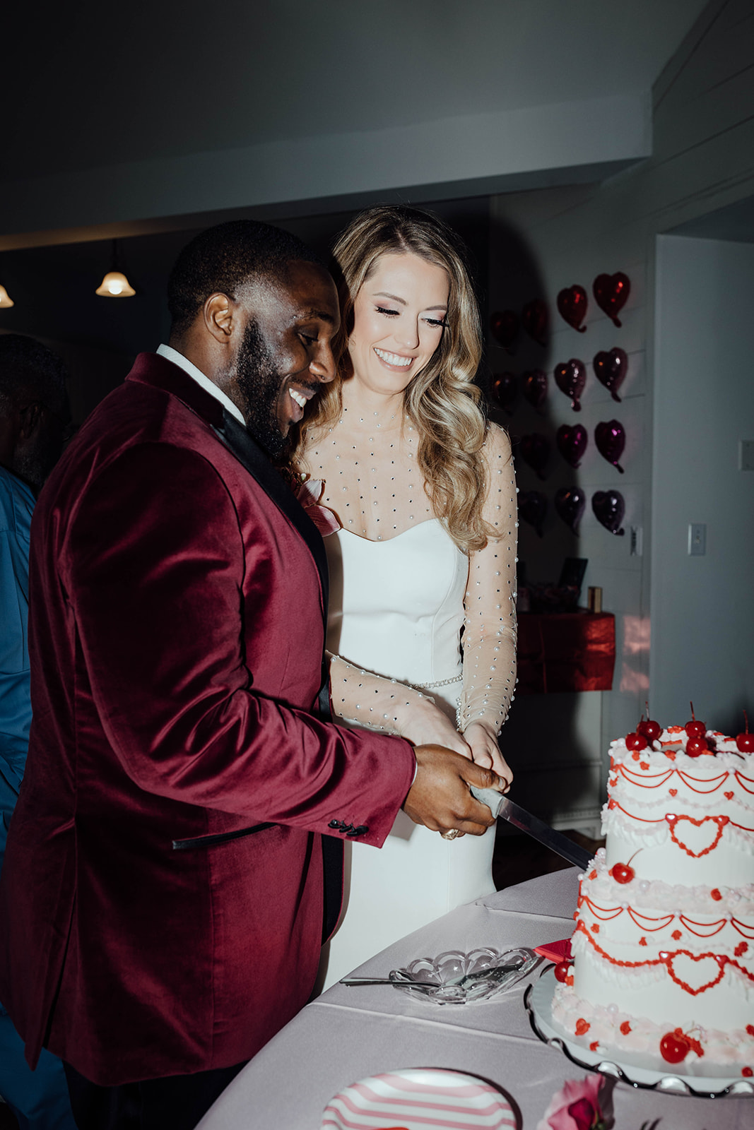 During their intimate dinner reception, they had a private Chef, Steve Harvey, cook everyone a hibachi dinner. You’ll notice in the photos that they really leaned into the Valentine’s Day wedding vibe in all their wedding details, from her nails painted pink with a heart to red heart sunglasses. Their dinner tablescape was filled with different shades of pink and red and, of course, hearts! All their wedding day details were so cute and romantic. They even had a vintage pink car during their couple’s portraits!