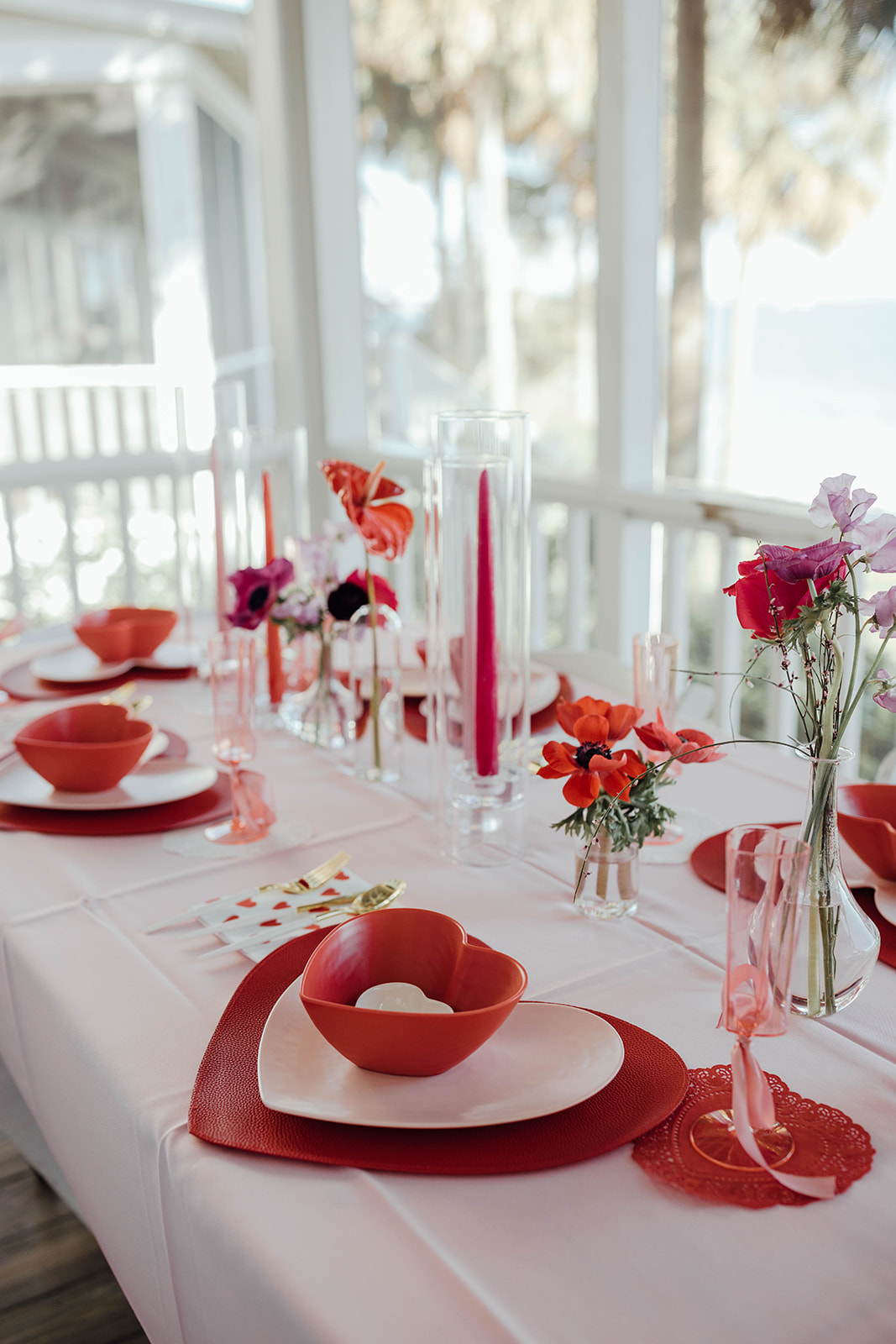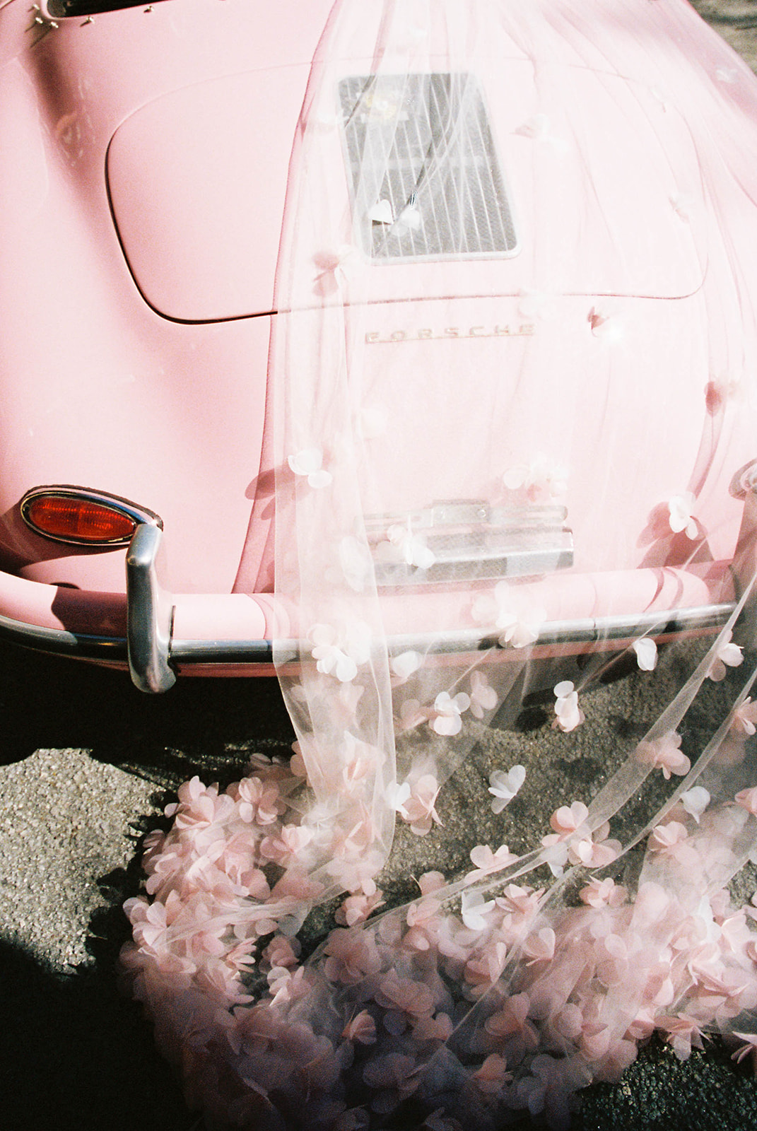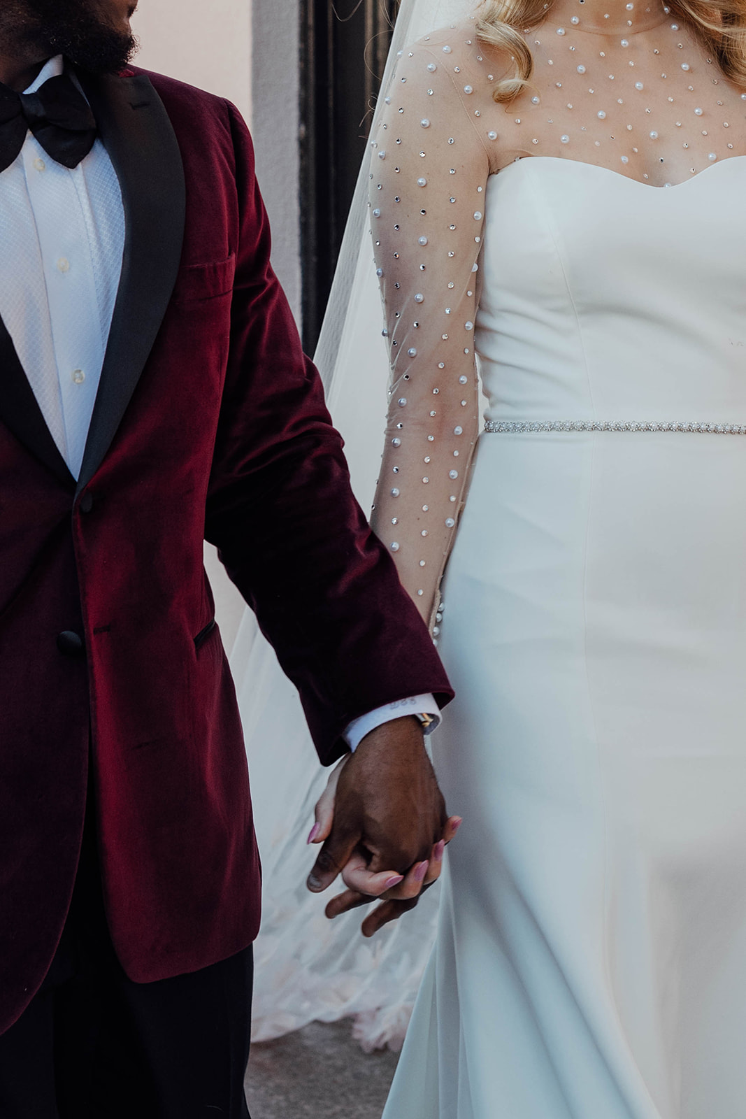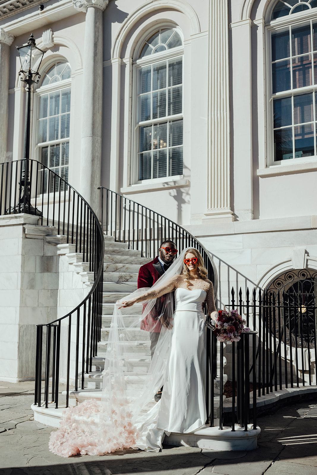 During their intimate dinner reception, they had a private Chef, Steve Harvey, cook everyone a hibachi dinner. You’ll notice in the photos that they really leaned into the Valentine’s Day wedding vibe in all their wedding details, from her nails painted pink with a heart to red heart sunglasses. Their dinner tablescape was filled with different shades of pink and red and, of course, hearts! All their wedding day details were so cute and romantic. They even had a vintage pink car during their couple’s portraits!